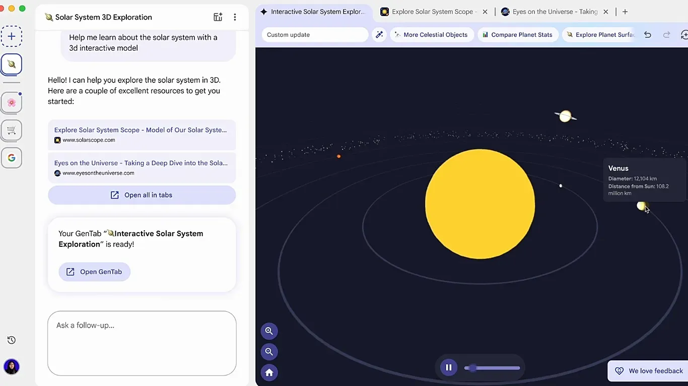Disco’nun merkezinde yer alan GenTabs, Google’ın Gemini 3 modeliyle çalışan ve anlık olarak etkileşimli arayüzler sunan mini uygulamalar anlamına geliyor. Kullanıcı örneğin “X ülkesine gezi planlıyorum” şeklinde bir proje başlattığında, önce otomatik olarak geziyle ilgili sekmeler açılıyor. Ardından harita, önerilen duraklar, takvim ve kaynak bağlantılarını içeren bir seyahat planlayıcı uygulama önerisi sunuluyor.