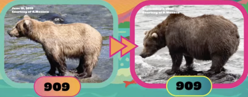 Bu, 2018 Şişman Ayı Haftası şampiyonu 409 Beadnose’un kızı. 909, şelalenin yanında balık yakalamayı çok seviyor, balıkları sadece ağzıyla yakalıyor.