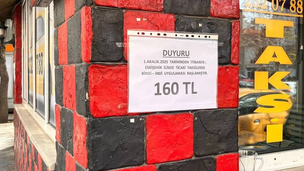 Eskişehir’de ticari taksiler için yapılan son ücret düzenlemesinin ardından taksi duraklarına bilgilendirme duyuruları asıldı. Yeni tarife kapsamında 1 Aralık 2025 tarihinden itibaren “bindi–indi” ücreti 160 TL olarak uygulanacak.