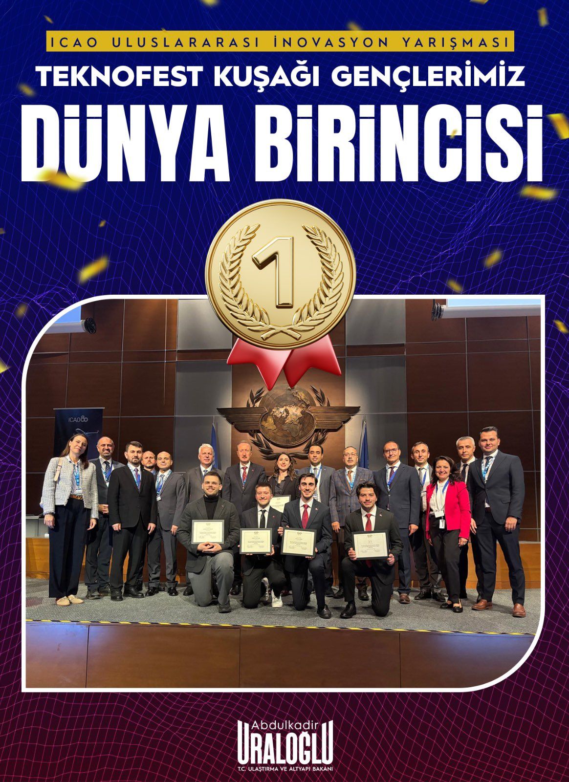 Ulaştırma ve Altyapı Bakanı Abdulkadir Uraloğlu, Türk öğrencilerin, havacılık sektörü için geliştirdikleri yapay zeka destekli çözümle, Uluslararası Sivil Havacılık Teşkilatı (ICAO) Uluslararası İnovasyon Yarışması’nda birinci olduğunu bildirdi.