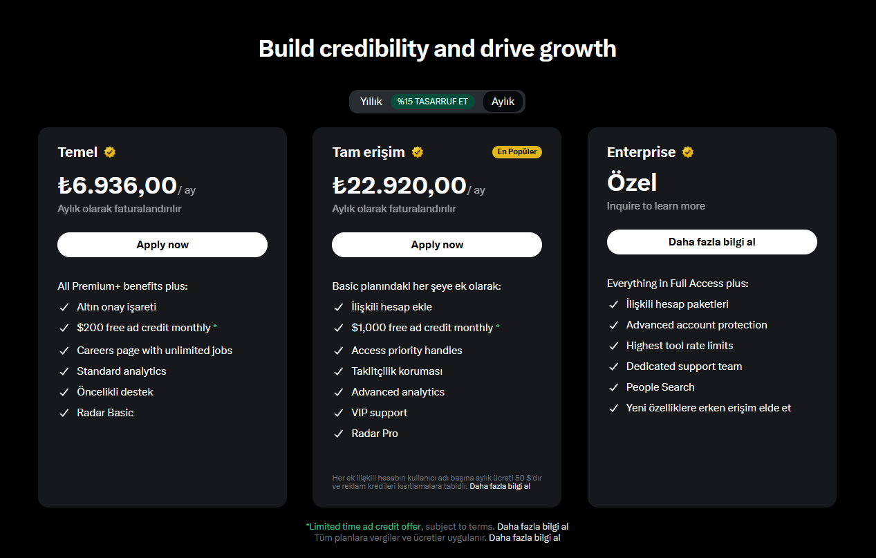 Basic paketi, aylık 6.936 TL ücretle temel kimlik doğrulama özellikleri sağlayacak. Full Access paketi, 22.920 TL bedelle kullanıcılara hızlı destek, sahte hesaplara karşı gelişmiş koruma, öncelikli kullanıcı adı alma hakkı, bağlı hesap yönetimi ve yeni özelliklere erken erişim imkanı sunacak. Enterprise seviyesi ise özel fiyatlandırma üzerinden sağlanacak ve gelişmiş yönetim araçlarıyla donatılacak.